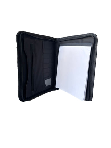 Carpeta elaborada en curpiel tamaño carta con cierre, block con 30 hojas, compartimento para tarjetas y porta bolígrafo. Medidas: 33.5cm x 26cm, con logo grabado en bajo relieve de 6cm de largo